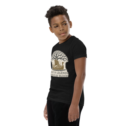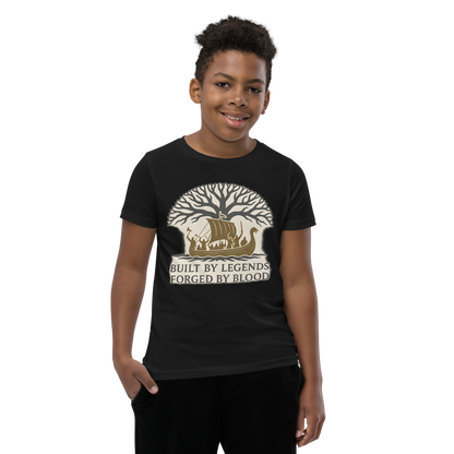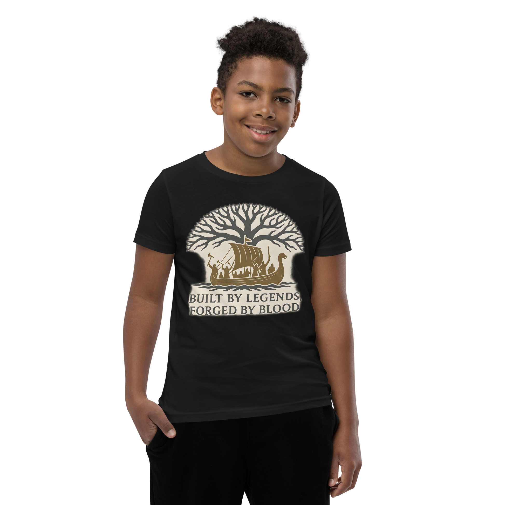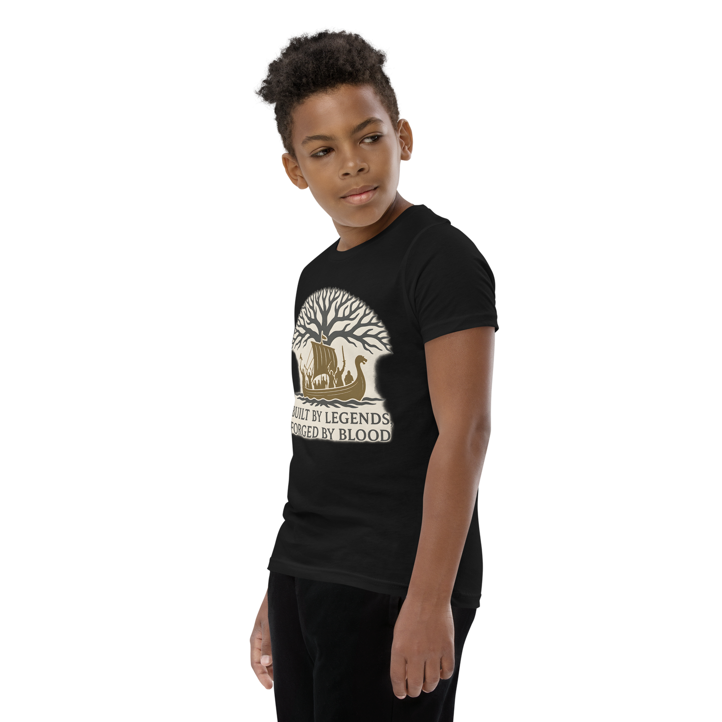 Under the mighty branches of Yggdrasil, the World Tree that connects all realms, a new generation sets sail toward their destiny. This design captures the eternal journey every young warrior must take—from the shores of childhood to the halls of legend, BUILT BY LEGENDS, FORGED BY BLOOD.
